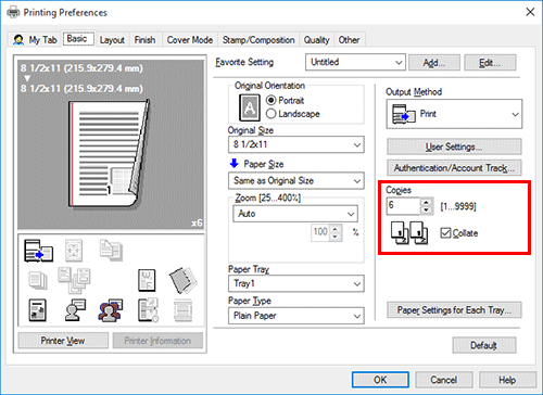 When the [Collate] check box on the [Basic] tab is selected, copies are output separately in a set-by-set manner, for example, "Pages 1, 2, 3, 4, and 5", "Pages 1, 2, 3, 4, and 5", and then "Pages 1, 2, 3, 4, and 5".