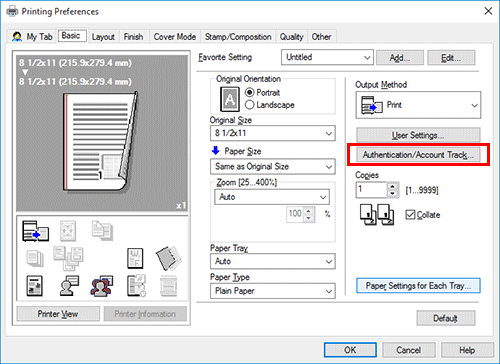 In the [Configure] tab of the printer driver, check that the User Authentication/Account Track setting is correctly configured.