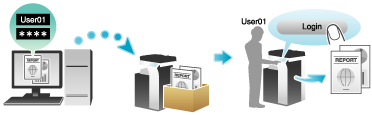 You need to perform user authentication on this machine to print the data saved in the User Box. Therefore, this function is suitable for safely printing highly confidential documents. When authentication succeeds, the print data of the login user is automatically printed. This enhances security as well as ensures smooth operation.
