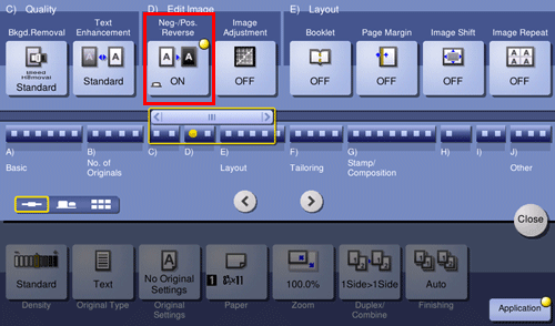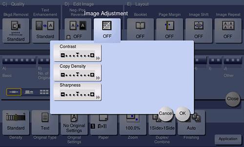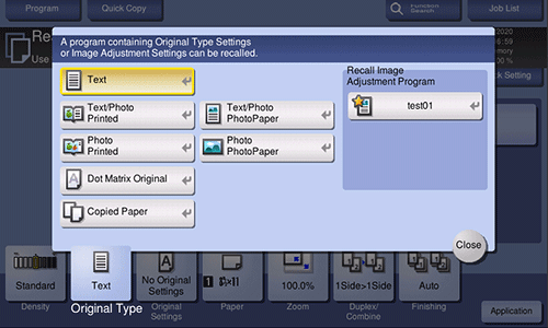 [Recall Image Adjustment Program] | Call the image quality adjustment program. The registered content of a program is applied. For the image adjustment program, you can register the settings of [Original Type], [Density], [Bkgd. Removal], [Text Enhancement], [Neg-/Pos. Reverse], [Image Adjustment], and [Mirror Image]. For details on the registration procedure, refer to Here. |