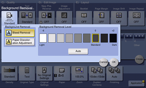 [Background Removal Level] | Adjusts the density of the background color for an original with a colored background. If [Auto] is selected, the density of the background color is determined automatically, and the original is copied at the optimal background density level. |