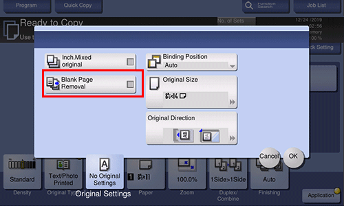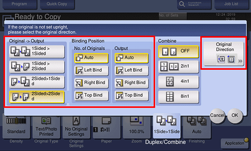 [Original > Output] | Select a combination of the original to be loaded (1-sided original or 2-sided original) and the copy method (1-sided copy or 2-sided copy). If you have selected other than [1Sided > 1Sided], also specify [Binding Position] and [Original Direction]. | |