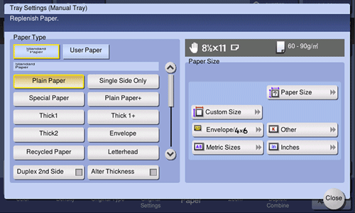[Paper Type] | Select the type of the paper loaded in the selected paper tray. For details on the available paper types, refer to Here. When you are using plain paper of 15-15/16 lb to 18-5/8 lb (60 g/m2 to 70 g/m2), tap [Alter Thickness]. The paper tray with [Alter Thickness] selected is set to a lower priority level than the paper trays in which plain paper is loaded. However, if [Alter Thickness] is selected for all paper trays, the appropriate paper tray is selected based on the priority sequence specified in [Auto Paper Tray Selection Setting] (Here). |