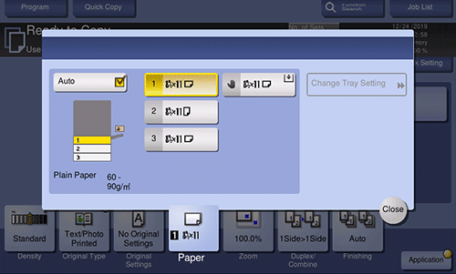 Paper Tray | Specifies the paper loaded in the paper tray when making a copy. The displayed contents vary depending on the options installed on this machine. |