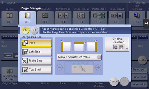 [ON]/[OFF] | Select [ON] to specify Binding Margin. |