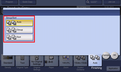 [Auto] | Automatically switches between Sort and Group according to the number of printed sheets for each set, and feeds out. If the number of printed sheets for each set is 1, the Group function is applied. If the number is 2 or larger, the Sort function is applied. |