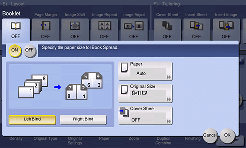 [Paper] | Select paper for copying. Select paper which corresponds to the size of a two-page spread of the booklet. |