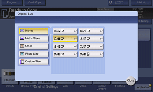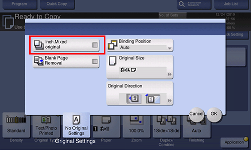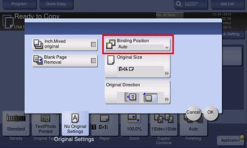 [Auto] | Automatically configures the binding position of the original. When the long side of the original is 11-11/16 inches (297 mm) or less, the binding position is set to the long side of the paper. When the long side of the original exceeds 11-11/16 inches (297 mm), the binding position is set to the short side of the paper. |