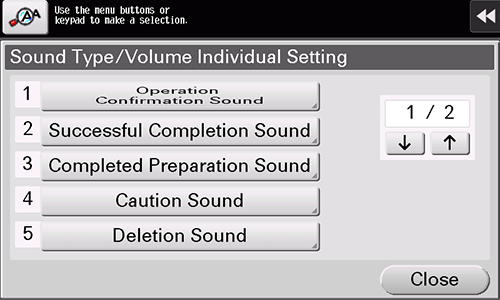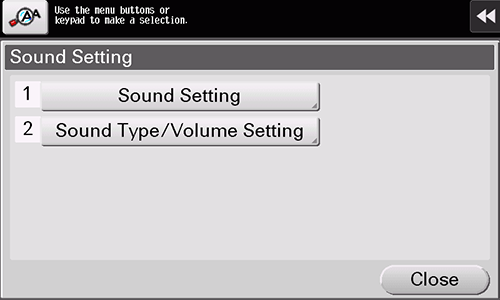 [Sound Type/Volume Setting] | Specify the sound type and volume for each of [Operation Confirmation Sound], [Successful Completion Sound], [Completed Preparation Sound], [Caution Sound], [Deletion Sound], and [Authentication Sound]. When [Batch Setting] is selected, all the sound type and volume will be set at once. When [Individual Setting] is selected, all the sound type and volume will be set separately. |