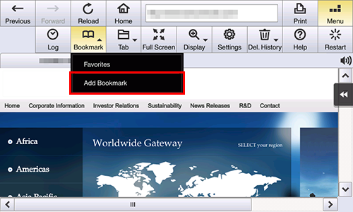 Display a page to be added as a favorite, then tap [Menu] - [Bookmark] - [Add Bookmark]. When necessary, change a page title, then tap [OK].