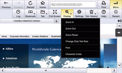 [Character Code] | Change the character code. The character code select screen is grouped for each region, which is to be displayed. If any garbled characters are detected, specify any character code, then switch the display of the Web page to deal with such an error. |