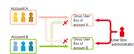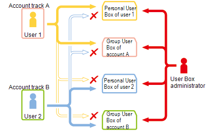 If Account Track has been implemented, a user can only access the Group User Box of the department the user belongs to. A user of another department cannot access this User Box.
