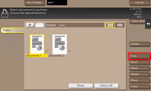 This example uses the Public User Box for explanatory purposes. To use a Personal User Box or a Group User Box, tap [Personal] or [Group], and select the desired User Box.