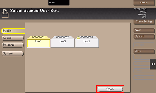 This example uses the Public User Box for explanatory purposes. To use a Personal User Box or a Group User Box, tap [Personal] or [Group], and select the desired User Box.
