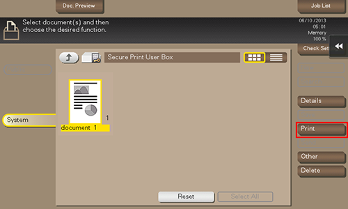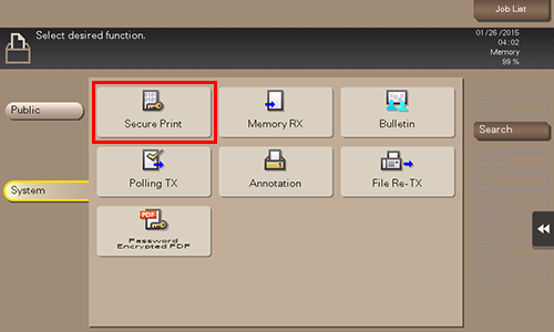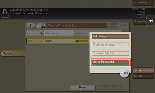 If [Prohibit Functions] is set to [Mode2] in [Utility] - [Administrator] - [Security] - [Security Details] - [Prohibit Functions], you need to also enter the password when selecting a file from the Secure Print User Box. You need to enter the password for each file even if secure documents have the same document ID. Therefore, the security level is higher than that of default [Mode1].