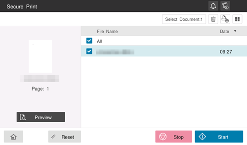 ) in the upper right to set print options.If [Prohibit Functions] is set to [Mode2] in [Utility] - [Administrator] - [Security] - [Security Details] - [Prohibit Functions], you need to also enter the password when selecting a file from the Secure Print User Box. You need to enter the password for each file even if secure documents have the same document ID. Therefore, the security level is higher than that of default [Mode1].