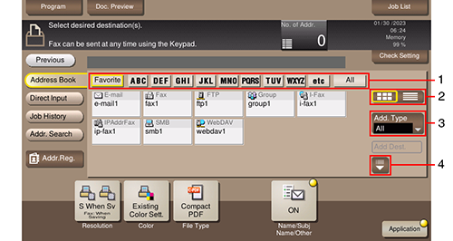 1 | Narrow down destinations with the index specified for the registered destination. Using [Add. Type] in combination further narrows down destinations. |