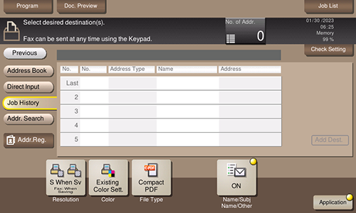 Tapping [Job History] displays a list of transmission logs. Specify the target destination from the previous five job histories.