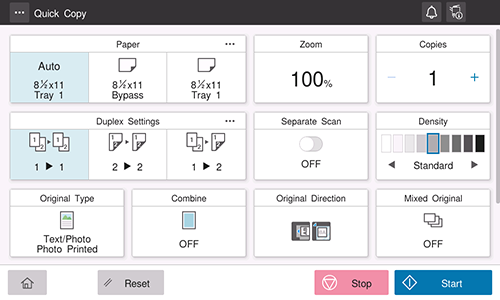 If you tap [Quick Copy] on the home screen, the main screen of quick copy mode is displayed.
