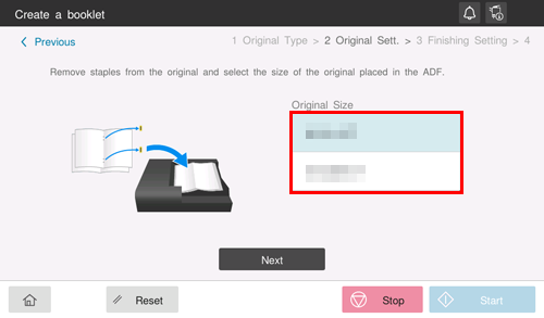 Copy the unstapled book original ([Booklet]) to create a booklet.