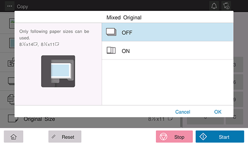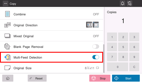 Selecting [Multi-Feed Detection] to ON stops scanning when the machine detects that the original is multiplexed on the ADF.