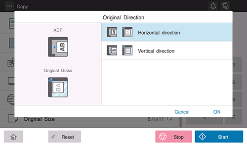 When scanning a 2-sided original, specify the original loading direction so that the vertical direction of the scanned original is set correctly.
