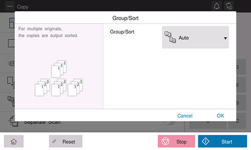 [Auto]: Automatically switches between Sort and Group according to the number of printed sheets for each set, and feeds out copies. If the number of printed sheets for each set is 1, the Group function is applied. If the number is 2 or larger, the Sort function is applied.