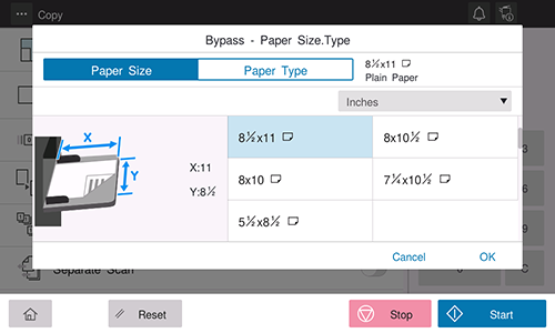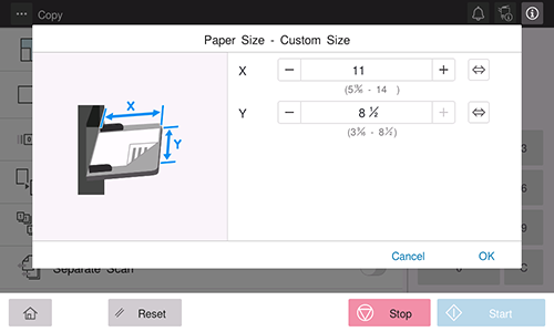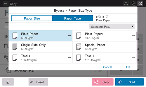 ) in [Plain Paper] of [Paper Type], and set to [Alter Thickness ON]. The paper tray set to [Alter Thickness ON] is placed to a low priority level among the paper trays in which plain paper is loaded. However, if [Alter Thickness ON] is set to all paper trays, the appropriate paper tray is selected based on the priority sequence specified in [Utility] - [Utility] - [System Settings] - [Auto Paper Tray Selection Settings].When loading custom-sized paper, directly enter the length and width of paper.