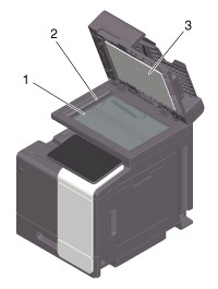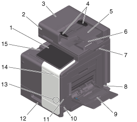 2 | Automatic Document Feeder | Automatically feeds and scans originals by page. This unit scans a 2-sided original by only requiring the paper be fed into the machine once without reversing. This unit is referred to as ADF in the manual. |