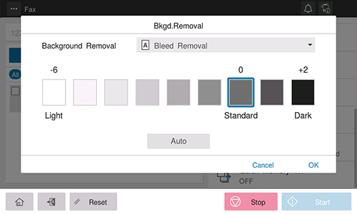 [Bleed Removal] | Adjust the density of the background color to prevent bleeding of the back of the paper when printing a 2-sided original that is so thin that the contents of the back side would be scanned. Selecting [Auto] automatically determines the density of the background color, and scans an original at the optimum background density level. |