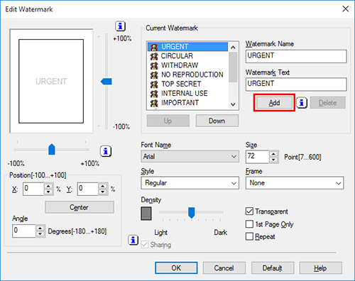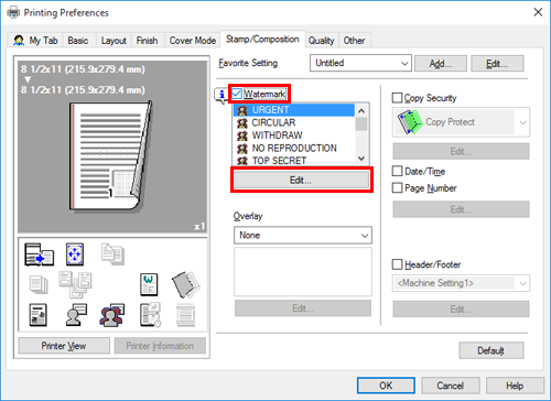 For details, refer to the [Edit Watermark] settings (described after this procedure).
