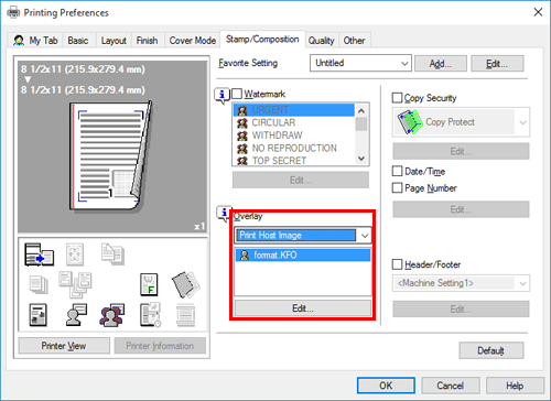 In [Overlay] in the [Stamp/Composition] tab, select [Print Host Image] or [Print Device Image] (PCL only), and then from the list, select the overlay image to be printed on the original as a composite image.