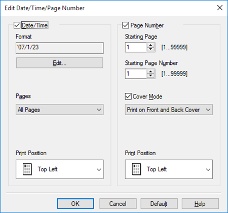 In the [Stamp/Composition] tab, select the [Date/Time] or [Page Number] check box.