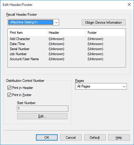 [Recall Header/Footer] | Select the header/footer to be recalled. If your computer can communicate with this machine, clicking [Obtain Device Information] obtains and displays the latest header/footer information registered in this machine. |