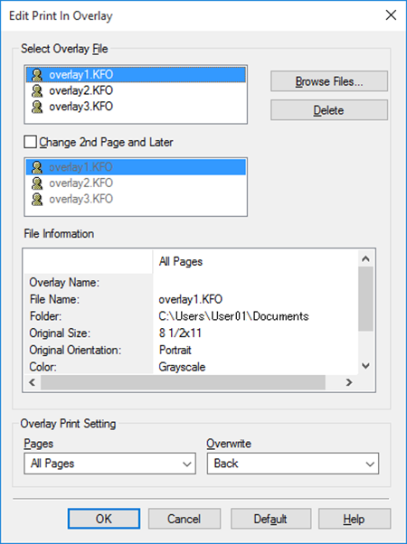 [Change 2nd Page and Later] | Select this check box to change the overlay image to be printed on the second and subsequent pages of the original. In addition, from the list, select the overlay image you want to use. | |