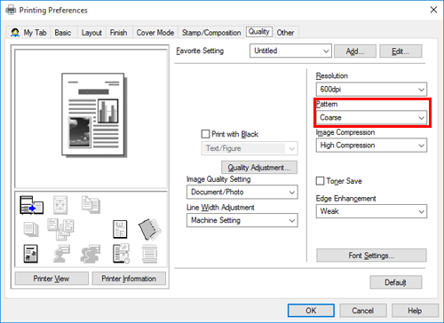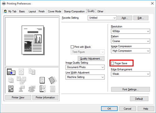 Selecting the [Toner Save] check box in the [Quality] tab adjusts the printing density in order to save the amount of toner consumed.