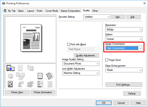 In [Image Compression] in the [Quality] tab, select whether the quality or printing speed is preferred when the image data contained in the original is compressed.