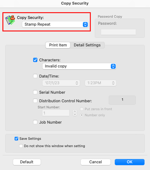 [Background Pattern] | Select the copy security pattern from the background patterns registered in this machine. |