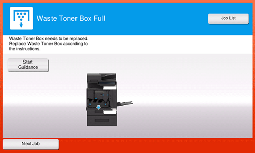 When the Waste Toner Bottle is full, a message appears to prompt you to replace it (at replacement by user). Tap [Start Guidance], then follow the displayed guidance to take an action.