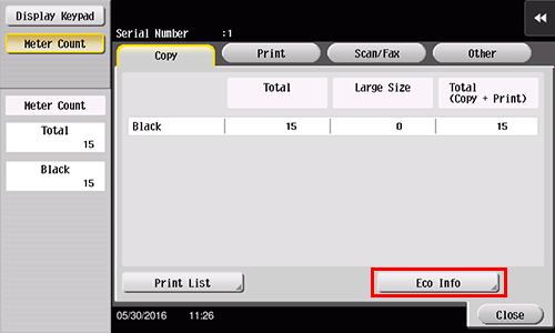 Eco information indicates the result of calculating the paper saving ratio and the accumulated time during power saving based on the user's use conditions. This information will help you gain an understanding of the usage status of this machine.