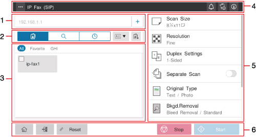 If you tap [IP Fax (SIP)] on the home screen, the main screen of IP fax (SIP) is displayed.