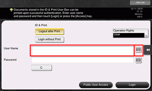 When user authentication is enabled on this machine, the login screen is displayed. Enter the user name and the password, and perform user authentication.
