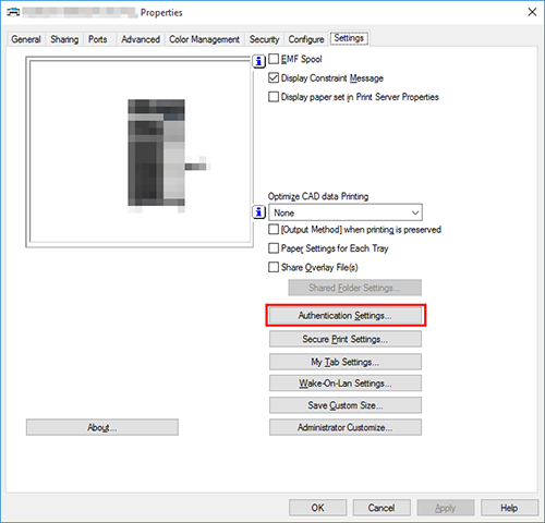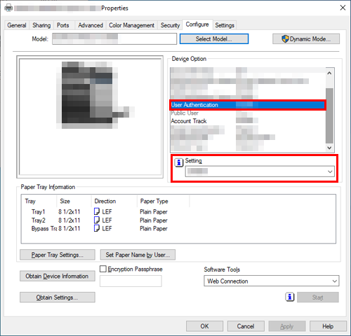 Select [User Authentication] from [Device Option] in the [Configure] tab, and select the authentication status from [Setting]. Then, click [OK]. For the authentication status to be specified, contact the administrator of this machine.