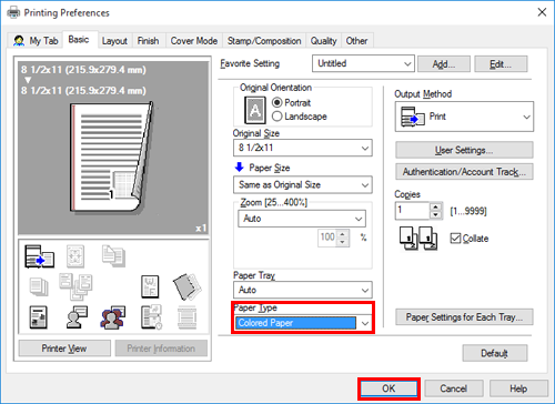 A. Yes. You can easily customize the window from the properties window of the printer driver by registering frequently used functions en masse on My Tab or registering settings for respective tabs as your favorite for quick activation.