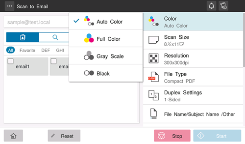 When setting a color mode, select [Color] on the Scan screen, and select the desired color mode. On this machine, the following color modes are supported.