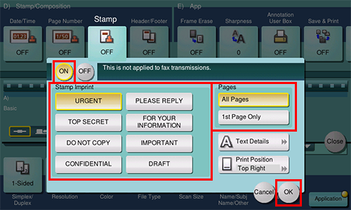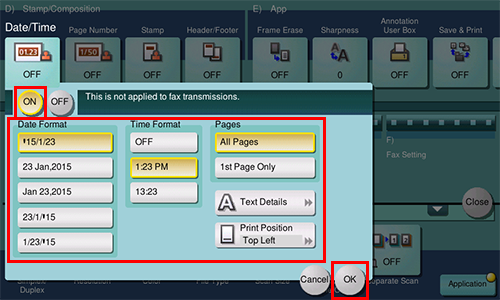 If the date/time, page number, and stamp are difficult to see with the default settings, tap [Text Details] on each of the [Date/Time], [Page Number], and [Stamp] setting screens; you can set the text size and font type. If the date and time, page numbers or stamp are over the text of the original, tap [Print Position] in each of the [Date/Time], [Page Number] and [Stamp] setting screens to set the printing positions.