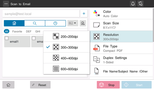 When setting the resolution, select [Resolution] on the Scan screen, and select the desired resolution. The greater the value, the finer granularity is achieved for the image.