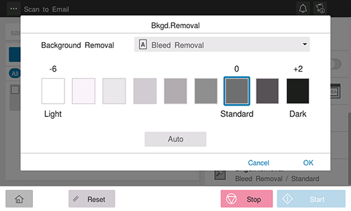 Select [Bkgd.Removal] on the Scan screen. Select [Bleed Removal] in [Background Removal], set the back bleeding level, and tap [OK]. Set to [Auto] to have this machine automatically adjust the bleed level.
