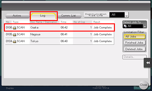 Tap [Job List], and check the transmission log in the [Log] tab. Select a log, then tap [Details..] to check the log details. You can narrow down logs to display using [Select Job Type] or [Limitation Filter].