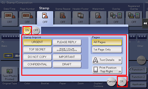 If the date/time, page number, and stamp are difficult to see with the default settings, tap [Text Details] on each of the [Date/Time], [Page Number], and [Stamp] setting screens; you can set the text size and font type. If the date and time, page numbers or stamp are over the text of the original, tap [Print Position] in each of the [Date/Time], [Page Number] and [Stamp] setting screens to set the printing positions.